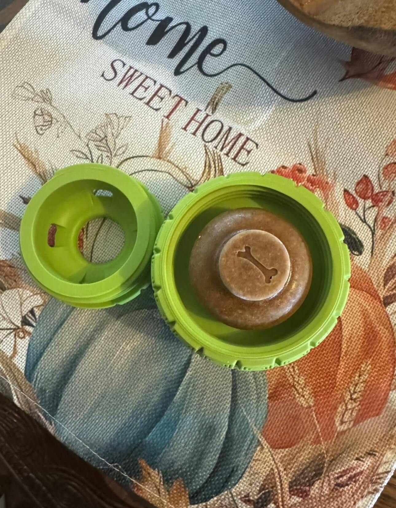 Step 1. Open up the toy by unscrewing the two halves, drop in a treat, and give it to your pup!